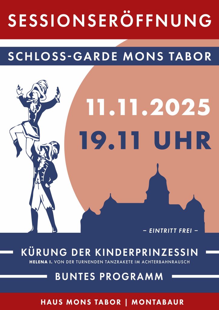 | 11.11.2025 – ab 19:11 Uhr | Sessionseröffnung der Schlossgarde Mons Tabor in der Stadthalle, mit Kürung der Kinderprinzessin Helena I. von der turnenden Tanzrakete im Achterbahnrausch. Eintritt frei!![]() |